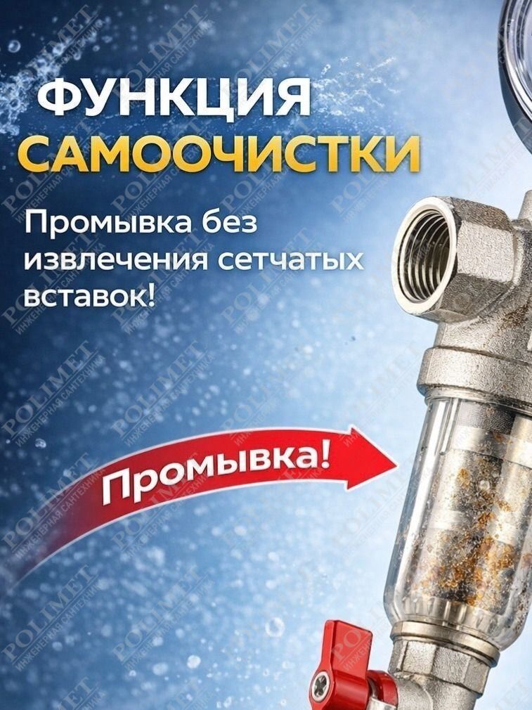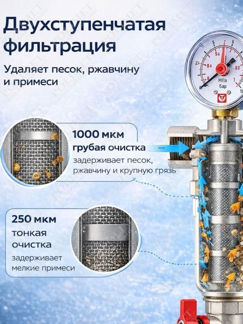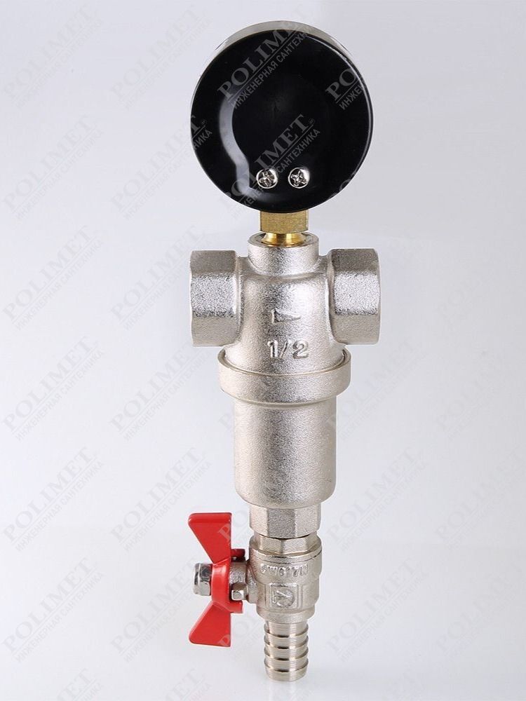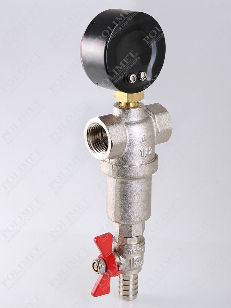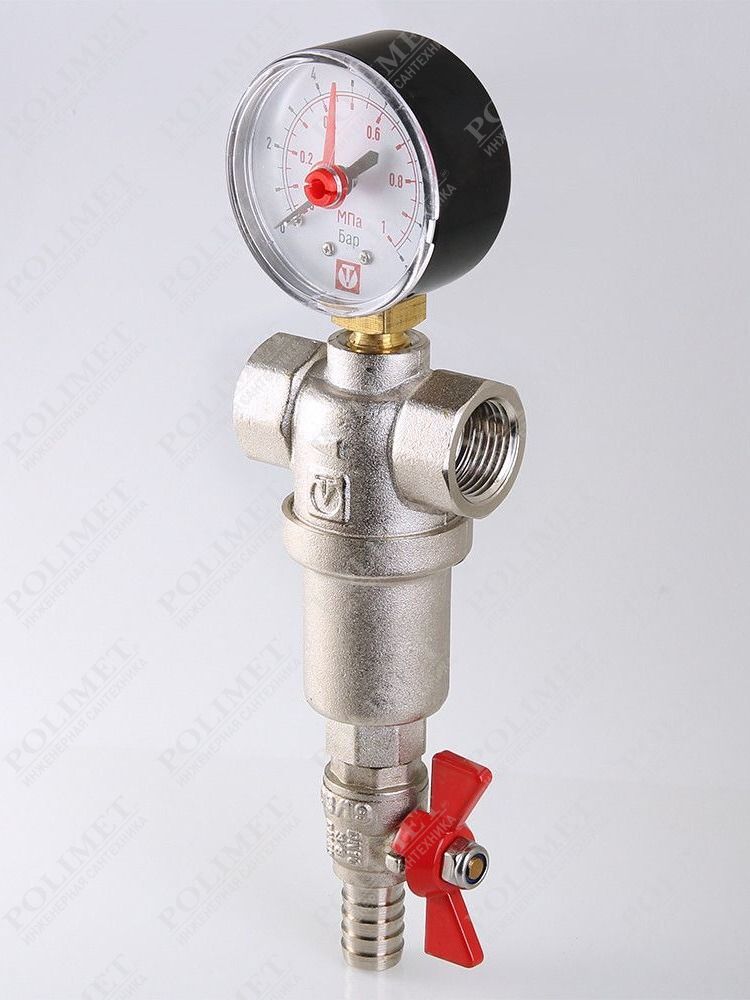 (VT.389.N) Компактный фильтр механической очистки воды с возможностью удаления накопившихся загрязнений без извлечения сетчатых вставок (промывной фильтр). Оснащен двумя (один в другом) фильтроэлементами из нержавеющей стали. Размер ячеек сетки первичного фильтроэлемента – 1000, вторичного – 250 мкм. Корпус и колба фильтра выполнены из латуни марки CW617N (европейский стандарт EN 12165), никелированы. Предусмотрены дренажный шаровой кран со штуцером для подключения шланга и манометр для контроля уровня загрязненности сеток. Фильтр монтируется в вертикальном положении, колбой вниз. Резьба присоединений – внутренняя.