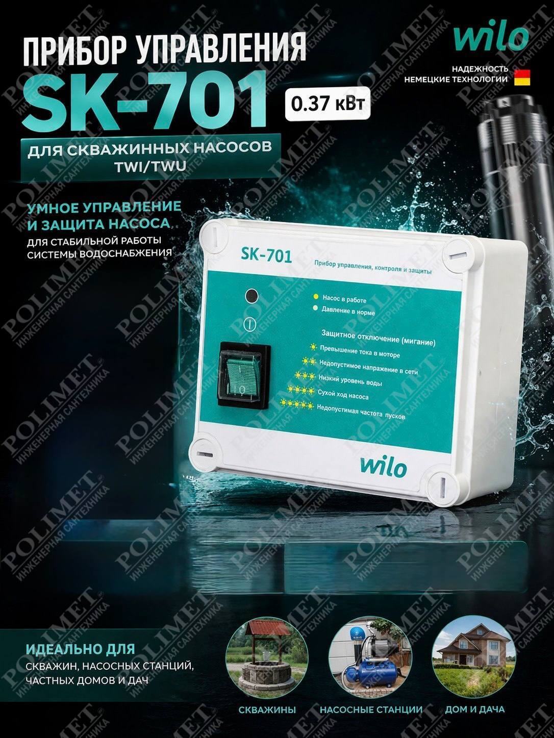 Прибор управления SK-701 для скважинных насосов TWI/TWU предназначен для: управления насосом при использовании реле давления, защиты насоса от работы при низком уровне воды в скважине с помощью погружных электродов, защиты мотора.